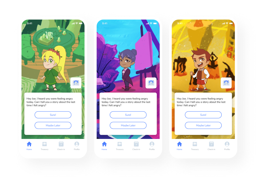 Our interactive app starts with a story based on the experience of a child who feels alone during the lockdown due to the pandemic. They suddenly see a light that opens a portal into a world where they are introduced to three life coaches: Flynn, Sprite, and Aurora, who provide them with storylines, quests, and activities.